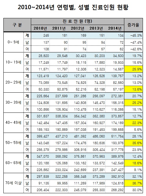 ¿¬·Éº°·Î´Â 70¼¼ ÀÌ»ó ȯÀÚ°¡ 2010³â 29¸¸¿©¸í¿¡¼ 2014³â 39¸¸¿©¸íÀ¸·Î 32.1% Áõ°¡ÇØ °¡Àå Å« ÆøÀ¸·Î »ó½ÂÇß´Ù. µÚ¸¦ À̾î 50´ë°¡ 39¸¸¿©¸í¿¡¼ 51¸¸¿©¸íÀ¸·Î 28.1%, 30´ë°¡ 22¸¸¿©¸í¿¡¼ 27¸¸¿©¸íÀ¸·Î 20.7% ´Ã¾ú´Ù.