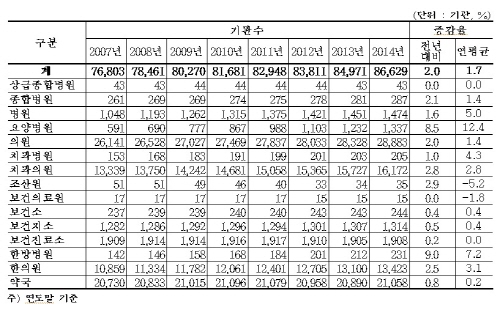 2014³â µî·Ï ¿ä¾ç±â°üÀº ÃÑ 8¸¸6629±â°üÀ¸·Î Àü³â´ëºñ 1658°³¼Ò°¡ Áõ°¡Çß°í, ¿¬Æò±Õ Áõ°¡À²(2007³â ±âÁØ)ÀÌ °¡Àå Å« Á¾º°Àº ¿ä¾çº´¿ø(12.4%)À¸·Î ³ªÅ¸³µ´Ù.