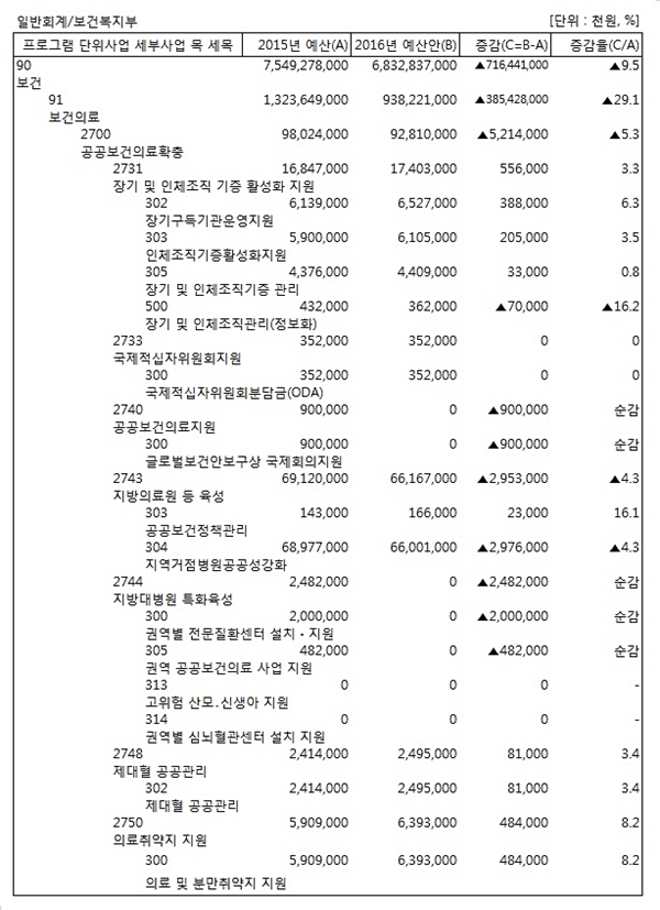 ¸ÕÀú Àüü °ø°øº¸°ÇÀÇ·á È®Ãæ ¿¹»êÀº 2015³â 980¾ï2400¸¸¿ø¿¡¼­ ³»³â 928¾ï1000¸¸¿øÀ¸·Î 52¾ï1400¸¸¿øÀÌ ÁÙ¾îµç´Ù. ¿©±â¿¡´Â '°ø°øº¸°ÇÀÇ·áÁö¿ø', 'Áö¹æ´ëº´¿ø ƯȭÀ°¼º', 'Á¦´ëÇ÷ °ø°ø°ü¸®' µî 7°³ ¼¼ºÎÇ׸ñÀÌ Æ÷ÇԵƴÙ.