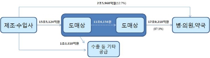ÀǾàǰ À¯Åë´Ü°èº° °ø±Þ±Ô¸ð¸¦ »ìÆìº¸¸é º´ÀÇ¿ø ¹× ¾à±¹¿¡ °ø±ÞÇÑ Ãѱݾ×Àº 20Á¶5186¾ï¿øÀ̸ç, Á¦Á¶¡¤¼öÀԻ翡¼ µµ¸Å¾÷ü¸¦ °æÀ¯ÇØ ¿ä¾ç±â°ü¿¡ °ø±ÞÇÑ ±Ý¾×ÀÌ 17Á¶9218¾ï¿øÀ¸·Î 87.3%ÀÇ Á¡À¯À²À» º¸¿´´Ù. µµ¸Å¾÷ü¸¦ °æÀ¯ÇÏÁö ¾Ê°í Á÷Á¢ °ø±ÞÇÑ ±Ý¾×Àº 2Á¶5968¾ï¿øÀ¸·Î ¼öÁØÀ̾ú´Ù.