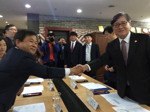 ¡ã Á¤Áø¿± Àå°ü°ú ±èÇÊ°Ç È¸ÀåÀÌ ¸é´ã¿¡ ¾Õ¼ ¾Ç¼ö¸¦ ³ª´©°í ÀÖ´Ù. |