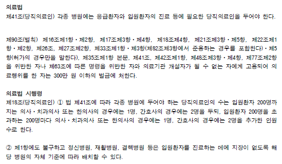 ÀÇ·á¹ý ½ÃÇà·É¿¡ µû¸£¸é ÀÔ¿øÈ¯ÀÚ 200¸í±îÁö´Â ÀÇ»çÀÇ °æ¿ì¿¡´Â 1¸í, °£È£»ç´Â 2¸íÀ» µÖ¾ß ÇÑ´Ù. 200¸íÀ» ÃʰúÇÒ °æ¿ì¿¡´Â ÀÇ»ç 1¸í, °£È£»ç 2¸íÀÌ Ãß°¡·Î ¹èÄ¡µÅ¾ß ÇÑ´Ù.