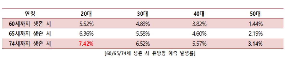 ºÐ¼®¿¡ µû¸£¸é ÇöÀç 50´ë ¿©¼ºÀÌ 74¼¼±îÁö »ýÁ¸ ½Ã À¯¹æ¾Ï ¹ßº´ È®·üÀÌ 3.14%Àε¥ ºñÇØ 20´ëÀÎ ¿©¼ºÀÌ °°Àº ³ªÀ̱îÁö »ýÁ¸ ½Ã À¯¹æ¾Ï¿¡ °É¸± È®·üÀÌ 7.42%·Î À§Çèµµ°¡ ¾à 2.4¹è³ª ³ô¾Ò´Ù. ÇöÀç 20´ëÀÎ ¿©¼º 13¸í Áß 1¸íÀº À¯¹æ¾Ï ȯÀÚ°¡ µÉ À§ÇèÀÌ ÀÖ´Â ¼ÀÀÌ´Ù.[¾Æ·¡ Ç¥]