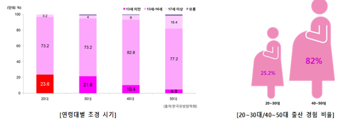 ¸ÕÀú 20´ë Áß 13¼¼ ¹Ì¸¸¿¡ ÃʰæÀ» °æÇèÇß´Ù´Â ÀÀ´äÀÚ°¡ 23.6%(59¸í)¿´Áö¸¸ 50´ëÀÇ °æ¿ì´Â 4.8%(12¸í)¿¡ ±×ÃÄ À̸¥ ÃʰæÀ¸·Î »ý¾Ö µ¿¾È ¿ù°æ ±â°£ÀÌ ±æ¾îÁö¸ç ¿©¼º È£¸£¸ó ³ëÃ⠱ⰣÀÌ ´Ã¾î³ª´Â °ÍÀ¸·Î ³ªÅ¸³µ´Ù.[¾Æ·¡ Ç¥]