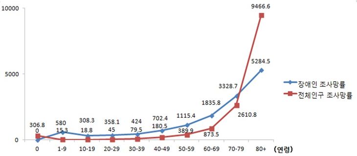 Àå¾ÖÀÎ Á¶»ç¸Á·üÀº 2164.8¸íÀ¸·Î ÀüüÀα¸ÀÇ Á¶»ç¸Á·üÀÎ 530.8¸í ´ëºñ 4¹è ´õ ³ô¾Ò´Ù. Á¶»ç¸Á·üÀº Àα¸ 10¸¸¸í ´ç »ç¸ÁÀÚ¼ö¸¦ ¸»ÇÑ´Ù.