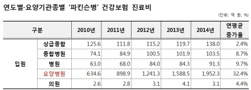 °Çº¸°ø´ÜÀº "ÆÄŲ½¼º´ Áø·áºñ°¡ Áõ°¡ÇÏ°Ô µÈ °ÍÀº ¿ä¾çº´¿ø ÀÔ¿ø ȯÀÚ¼ö°¡ ¸¹°í, ÀÔ¿øÀϼö°¡ ±æ¾ú±â ¶§¹®ÀÌ´Ù¡±¶ó°í ºÐ¼®Çß´Ù. |