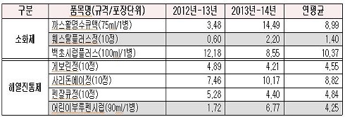 ÀÏ·Ê·Î ¾ÈÀü»óºñÀǾàǰ ÆÇ¸ÅÁ¦µµ°¡ µµÀÔµÈ 2012³âºÎÅÍ ÀÛ³â±îÁö ÆíÀÇÁ¡¿¡¼ ÆÇ¸Å ÁßÀÎ ÈѽºÅ»Ç÷¯½ºÁ¤(10Á¤)ÀÇ ¿¬Æò±Õ °¡°Ý»ó½Â·üÀº 1.40%¿¡ ºÒ°úÇß´Ù.