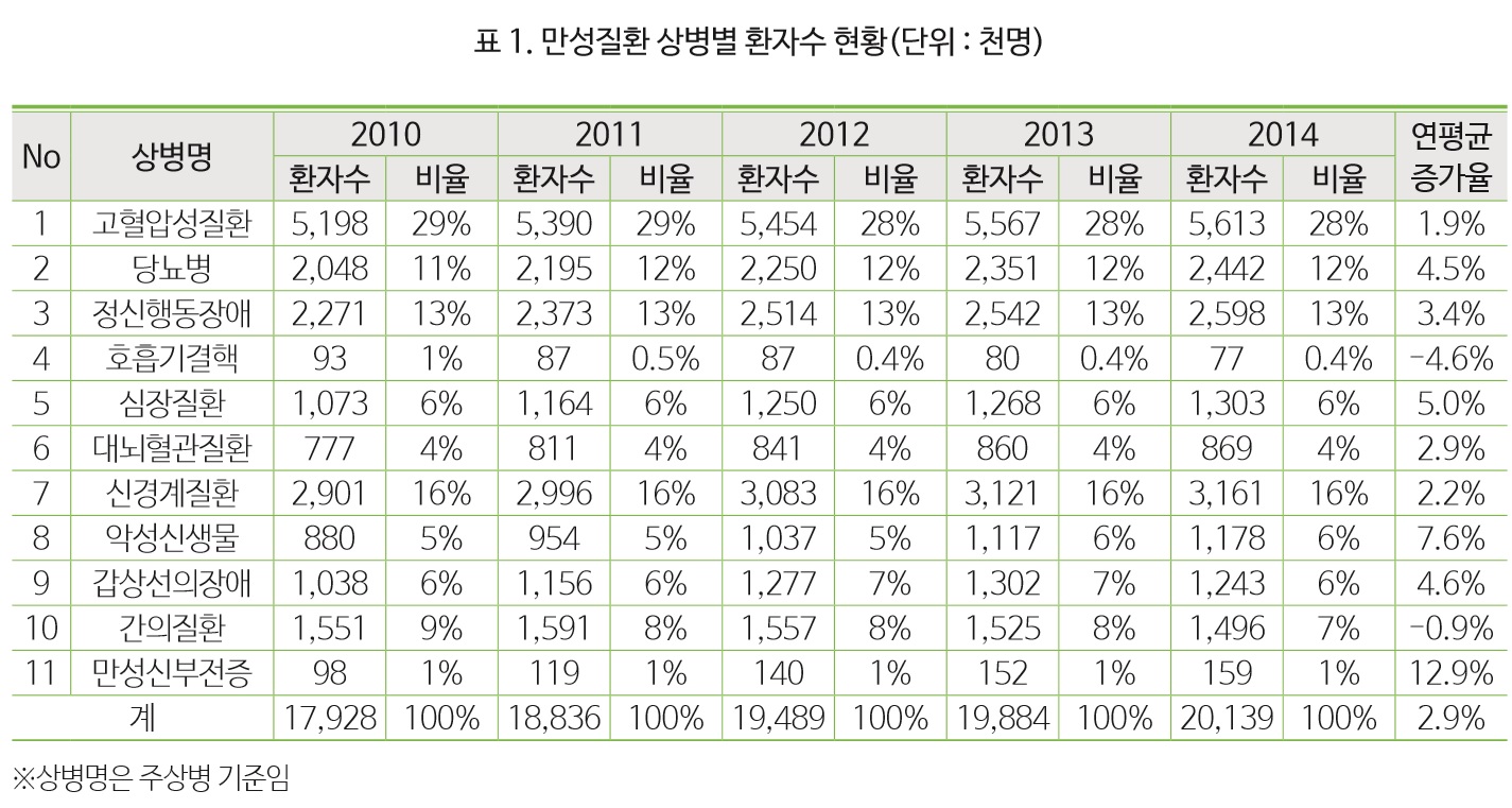 2014³â ¸¸¼ºÁúȯ Áø·áºñ´Â 18Á¶8350¾ï¿øÀ¸·Î Áý°èµÆ´Ù. Áúȯº°·Î »ìÆìº¸¸é ¾Ç¼º½Å»ý¹° 24%(4Á¶4970¾ï¿ø), Á¤½ÅÇൿÀå¾Ö 14%(2Á¶7110¾ï¿ø), °íÇ÷¾Ð¼ºÁúȯ 13%(2Á¶5210¾ï¿ø), ´ë³úÇ÷°üÁúȯ 11%(2Á¶1050¾ï¿ø)·Î ÆÄ¾ÇµÆ´Ù.