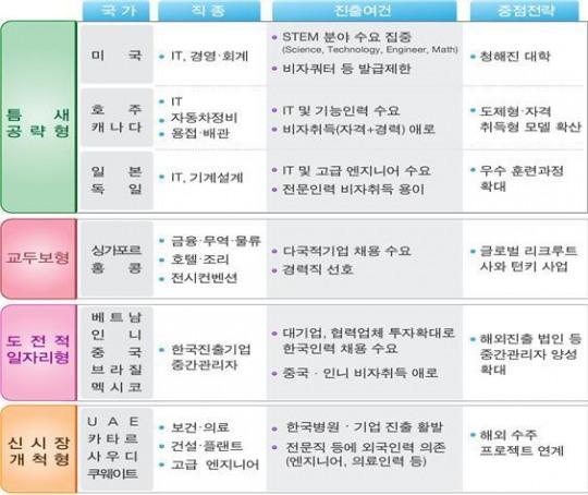 °í¿ëºÎ´Â ±×¹Û¿¡ ÇØ¿ÜÁøÃâ Àü¸Á ±¹°¡µéÀ» Æ´»õ °ø·«Çü¡¤±³µÎº¸Çü¡¤µµÀüÀû ÀÏÀÚ¸®Çü ±¹°¡·Î ºÐ·ùÇØ, ±¹³» û³âµéÀÇ ÇØ¿ÜÃë¾÷À» µ½´Â´Ù´Â °èȹÀÌ´Ù.