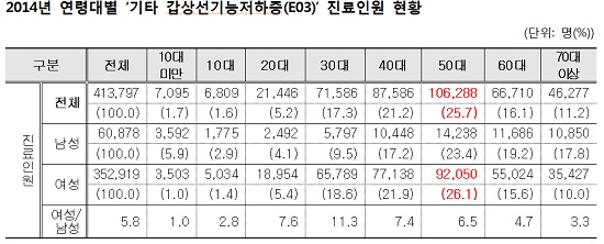 ÃßÀ§³ª ÇǷΰ¨ÀÌ ½ÉÇÏ°Ô ´À²¸Áö´Â °©»ó¼±±â´ÉÀúÇÏÁõ ȯÀÚ°¡ Áö¼ÓÀûÀ¸·Î ´Ã°í ÀÖ´Ù. ƯÈ÷ 50´ë ¿©¼ºÀÌ Â÷ÁöÇÏ´Â ºñÁßÀÌ Ä¿Á® ÁÖÀǰ¡ ¿ä±¸µÈ´Ù.