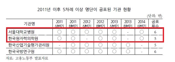 °í¿ë³ëµ¿ºÎ´Â »ó‧ÇϹݱ⠿¬ 2ȸ¿¡ ³ª´² ¸í´ÜÀ» °ø°³Çϰí ÀÖÀ¸¸ç ¼¿ï´ëº´¿øÀº 2013³â ÇϹݱ⸦ Á¦¿ÜÇϰí ÃÖ±Ù 5³â °£ 7¹øÀÇ °øÇ¥ ´ë»ó¿¡ 6¹ø ¿Ã¶ú´Ù. Çѱ¹¿øÀÚ·ÂÀÇÇпøÀº 5¹ø °øÇ¥µÆ´Ù.[¾Æ·¡ Ç¥]
