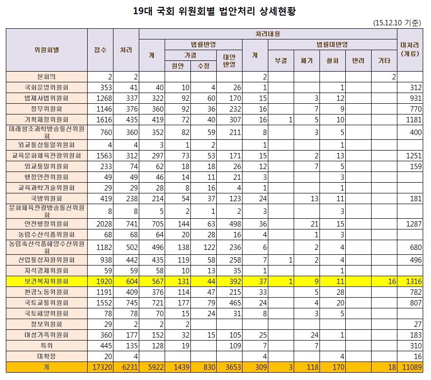 Áö±Ý±îÁö º¹ÁöÀ§¿¡ Á¢¼öµÈ ¹ý¾ÈÀº 1933°ÇÀÌ´Ù. ÀÌ´Â 2048°ÇÀÌ Á¢¼öµÈ ¾ÈÀüÇàÁ¤À§¿øÈ¸ ´ÙÀ½À¸·Î ¸¹Àº ¼öÄ¡´Ù. ±×·³¿¡µµ 󸮺ñÀ²·Î µûÁö¸é 31.8%¿¡ ºÒ°úÇÏ´Ù. 26°³ À§¿øÈ¸ Áß µÚ¿¡¼ 7¹øÂ°´Ù.