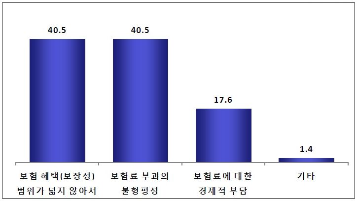±¹¹Î°Ç°º¸Çè¿¡ ´ëÇØ ºÒ¸¸Á·½º·´´Ù°í ÀÀ´äÇÑ »çÀ¯·Î´Â ¡®³ÐÁö ¾ÊÀº º¸Çè ÇýÅᯰú ¡®º¸Çè·á ºÎ°ú ºÒÇüÆò¼º¡¯ µîÀÌ °¢°¢ 40.5%¸¦ Â÷ÁöÇß´Ù.(Áߺ¹ÀÀ´ä)