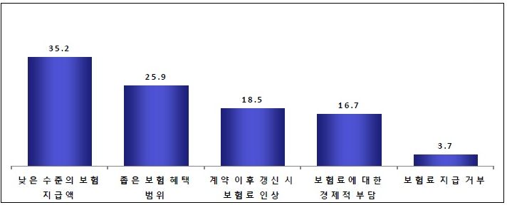¹Î°£ÀǷẸÇèÀÇ °æ¿ì ¡®³·Àº ¼öÁØÀÇ º¸ÇèÁö±Þ¾×¡¯ÀÌ 35.2%, ¡®Á¼Àº º¸Çè ÇýÅà ¹üÀ§¡¯°¡ 25.9%·Î ³ªÅ¸³µ´Ù. ¡®°»½Å½Ã º¸Çè·á Àλ󡯿¡ ´ëÇÑ ºÒ¸¸µµ 18.5%¿¡ ´ÞÇß´Ù.