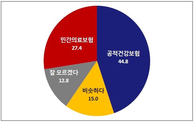 µÎ º¸Çè Áß ÇýÅÃÀÌ Å©´Ù°í »ý°¢ÇÏ´Â ºñÁßÀº ±¹¹Î°Ç°º¸ÇèÀÌ 44.8%·Î ¹Î°£ÀǷẸÇè(27.4%·Î) º¸´Ù ¸¹¾Ò´Ù. ¡®ºñ½ÁÇÏ´Ù¡¯(15.0%), ¡®Àß ¸ð¸£°Ú´Ù¡¯(12.8%)´Â ÀÀ´äµµ ÀÖ¾ú´Ù.