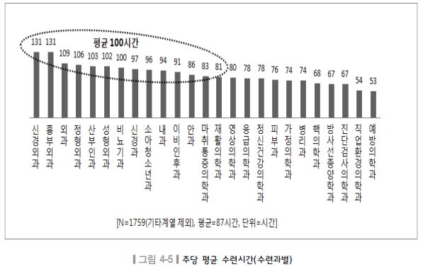 Àü°øÀǵéÀÌ ÁÖ´ç ÃÖ´ë 80½Ã°£À» Ãʰú ±Ù¹«ÇÒ ¼ö ¾øµµ·Ï ÇÑ ±ÔÁ¤°ú ´Þ¸®, ½ÇÁ¦ ÀÇ·áÇöÀå¿¡¼´Â ÃÖ´ë ÁÖ´ç 100½Ã°£ÀÌ ³Ñ°Ô ÀÏÇϰí ÀÖ´Â °ÍÀ¸·Î ³ªÅ¸³µ´Ù. ´ëÇÑÀÇ»çÇùȸ ÀÇ·áÁ¤Ã¥¿¬±¸¼Ò°¡ Áö³ÇØ 3¿ù ´ëÇÑÀü°øÀÇÇùÀÇȸ µî·Ï ȸ¿ø 1¸¸768¸íÀ» ´ë»óÀ¸·Î ¡®2015³â Àü°øÀÇ ¼ö·Ã ¹× ±Ù¹«È¯°æ ½ÇÅÂÁ¶»ç¡¯¸¦ ½Ç½ÃÇÑ °á°ú, Á¶»ç¿¡ ÀÀ´äÇÑ 1793¸íÀÇ ÁÖ´ç Æò±Õ ±Ù¹«½Ã°£Àº 89.6½Ã°£ÀÎ °ÍÀ¸·Î ³ªÅ¸³µ´Ù. ÀÌ¿¡ µû¸£¸é, ÁÖ´ç 80½Ã°£À» ÃʰúÇØ ±Ù¹«ÇÏ´Â Àü°øÀÇ´Â ÀüüÀÇ 52.9%·Î °ú¹Ý¼ö ÀÌ»óÀ» Â÷ÁöÇϸç, ¸¹Àº Àü°øÀǵéÀÌ ±ÔÁ¤»ó ¼ö·Ã½Ã°£À» ÃʰúÇØ ±Ù¹«Çϰí ÀÖ¾ú´Ù. ÁÖ´ç 88½Ã°£À» ÃʰúÇØ ±Ù¹«ÇÑ´Ù°í ÀÀ´äÇÑ ºñÀ²Àº 44.7%·Î Áý°èµÆ´Ù. ¡®100½Ã°£ Ãʰú¡¯´Â 27.1%, ¡®60½Ã°£ Ãʰú~80½Ã°£ ÀÌÇÏ¡¯´Â 26.6%, ¡®80½Ã°£ Ãʰú~100½Ã°£ ÀÌÇÏ¡¯´Â 25.8%, ¡®40½Ã°£ Ãʰú~60½Ã°£ ÀÌÇÏ¡¯´Â 18.0%, ¡®40½Ã°£ ÀÌÇÏ¡¯´Â 1.9% ¼øÀ¸·Î ³ªÅ¸³µ´Ù. ¼ö·Ãº´¿ø Áö¿ªº°·Î´Â ÃæÃ»µµ¡¤´ëÀü¡¤¼¼Á¾½Ã ¼ÒÀç ±â°ü Àü°øÀǵéÀÌ ÁÖ´ç Æò±Õ ¼ö·Ã½Ã°£ 92.0½Ã°£À¸·Î °¡Àå ±æ°Ô ±Ù¹«Çϰí ÀÖ´Â °ÍÀ¸·Î Á¶»çµÆ´Ù. ÀÌ¾î °¿øµµ(91.9½Ã°£), ¼¿ï(90.6½Ã°£), °æ±âµµ ¹× ÀÎõ(87.0½Ã°£) ¼øÀ¸·Î Á¶»çµÆ´Ù. º´¿ø Á¾·ùº°·Î´Â ´ëÇк´¿ø Àü°øÀǵéÀÇ ÁÖ´ç Æò±Õ ¼ö·Ã½Ã°£ÀÌ 90.4½Ã°£À¸·Î °¡Àå ¸¹Àº °ÍÀ¸·Î Á¶»çµÆÀ¸¸ç, À̾î Á¾ÇÕº´¿ø 85.3½Ã°£, ´Ü°úÀü¹®º´¿ø 76.8½Ã°£ ¼øÀ¸·Î ³ªÅ¸³µ´Ù. ƯÈ÷ ¡®»ç¸³´ëÇк´¿ø¡¯ÀÇ ÁÖ´ç Æò±Õ ¼ö·Ã½Ã°£ÀÌ °¡Àå ±æ¾ú´Ù. »ç¸³´ëÇк´¿øÀº 91.6½Ã°£, »ç¸³´ëÇк´¿ø ¿Ü ¹Î°£º´¿øÀº 88.6½Ã°£, ±¹¸³´ëÇк´¿øÀº 86.4½Ã°£, ´ëÇк´¿ø¿Ü ±¹°ø¸³º´¿øÀº 85.6½Ã°£ ¼øÀ̾ú´Ù. ÀÎÅÏ 110.9½Ã°£¡¦¿Ü°ú°è¿ 100.5½Ã°£ Ãʰú±Ù¹« ¼ö·Ã¿¬Â÷º°·Î´Â ÀÎÅÏÀÌ ÁÖÀå Æò±Õ 110.9½Ã°£À¸·Î °¡Àå ¸¹¾ÒÀ¸¸ç ·¹Áö´øÆ® 1³âÂ÷´Â 105.0½Ã°£, 2³âÂ÷´Â 98.5½Ã°£, 3³âÂ÷ 86.0½Ã°£, 4³âÂ÷´Â 77.2½Ã°£ ¼øÀ¸·Î ³ªÅ¸³ª ¿¬Â÷°¡ ³·À»¼ö·Ï ¾÷¹«ÀÇ ¾çÀÌ ¸¹Àº °ÍÀ¸·Î Á¶»çµÆ´Ù. ¼ö·Ã°úº°·Î´Â ¿Ü°ú°è¿ÀÌ ÁÖ´ç Æò±Õ 100.5½Ã°£ ±Ù¹«·Î °¡Àå ¸¹¾ÒÀ¸¸ç ÀÌ¾î ³»°ú°è¿ 86.8½Ã°£, Áö¿ø°è¿ 76.0½Ã°£À¸·Î Áý°èµÆ´Ù. ÁÖ´ç 80½Ã°£À» ÃʰúÇÏ´Â 14°³ °ú Áß 6°³°ú(ÈäºÎ¿Ü°ú, »êºÎÀΰú, ºñ´¢±â°ú, ½Å°æ°ú, ³»°ú, ÀçȰÀÇÇаú)´Â 2014³â ´ëºñ Æò±Õ ÁÖ´ç ¼ö·Ã½Ã°£ÀÌ Áõ°¡ÇßÀ¸¸ç, ÀçȰÀÇÇаú´Â 2015³â ÁÖ´ç ¼ö·Ã½Ã°£ÀÌ 80½Ã°£À» ÃʰúÇÑ °ÍÀ¸·Î ³ªÅ¸³µ´Ù. ¶Ç 2°³°ú(Á¤Çü¿Ü°ú, À̺ñÀÎÈİú)´Â 2014³â°ú ÁÖ´ç ¼ö·Ã½Ã°£ÀÌ µ¿ÀÏÇÏ°Ô ³ªÅ¸³µÀ¸¸ç, 5°³°ú(½Å°æ¿Ü°ú, ¿Ü°ú, ¼Ò¾ÆÃ»¼Ò³â°ú, ¾È°ú, ¸¶ÃëÅëÁõÀÇÇаú)´Â °¨¼ÒÇѰÍÀ¸·Î Á¶»çµÆ´Ù.