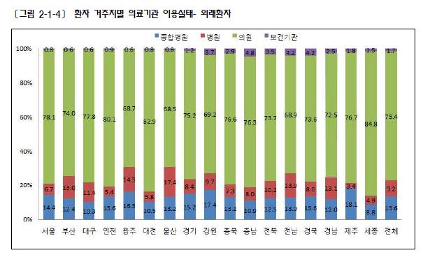 À̸¦ ´Ù½Ã °ÅÁÖÁöº°·Î ³ª´²º¸¸é, Á¾ÇÕº´¿ø ÀÌ¿ëÀÌ ¸¹Àº Áö¿ªÀº Á¦ÁÖ(18.1%)¿´°í, °¿ø(17.4%), ±¤ÁÖ(16.3%), °æ±â(15.2%), ¼¿ï(14.4%), ÀÎõ(13.6%) ¼øÀ¸·Î ³ªÅ¸³µ´Ù. »ó´ëÀûÀ¸·Î Á¾ÇÕº´¿ø ¿Ü·¡ÀÌ¿ëºñÀ²ÀÌ ³·Àº Áö¿ªÀº ¼¼Á¾(8.8%)À̾ú´Ù.