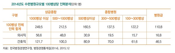 ¸ÕÀú 2014³âµµ º´¿ø°æ¿µÅë°è¿¡ µû¸£¸é º´¿ø±Þ ±â°üÀÇ ÀÇ»ç, °£È£»ç µîÀÇ ÀηÂÀÌ ´ëÇüº´¿øÀÇ ¹ÝÅ丷 ¼öÁØ¿¡ ºÒ°úÇÑ °ÍÀ¸·Î ³ªÅ¸³µ´Ù.[¾Æ·¡ Ç¥]