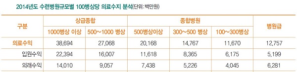 º´¿ø±Ô¸ðº° 100º´»ó ´ç ÀÇ·á¼öÁö µ¿ÇâÀ» »ìÆìº¸¸é 1000º´»ó ÀÌ»óÀÇ ´ëÇüº´¿ø°ú º´¿ø±Þ ÀÇ·á±â°üÀÇ ¼öÀÍÀº 3¹è Â÷À̸¦ º¸¿´´Ù.[¾Æ·¡ Ç¥]
