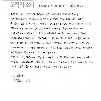 Á¤ °£È£»çÀÇ ¼±ÇàÀº ÀÌ 60´ë ³²¼ºÀÇ °¡Á·ÀÌ ºÎ»ê´ëº´¿ø °í°´ »ó´ã½Ç¿¡ °¨»çÀÇ ¸»°ú ÇÔ²² Ä£ÀýÁ÷¿øÃßõ ¸Þ½ÃÁö¸¦ ¶ç¿ì¸é¼ ¾Ë·ÁÁ³´Ù.