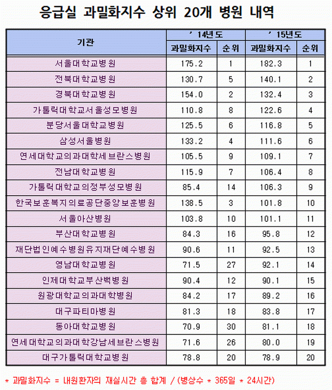 ÀÀ±Þ½ÇÀÌ °¡Àå °ú¹ÐÇÑ º´¿øÀº ¼¿ï´ëº´¿øÀ¸·Î, °ú¹ÐÈÁö¼ö°¡ 182%¿¡ ´ÞÇß´Ù. À̾î ÀüºÏ´ëº´¿ø(140%), °æºÏ´ëº´¿ø(132%), ¼¿ï¼º¸ðº´¿ø(122.6%), ºÐ´ç¼¿ï´ëº´¿ø(116.8%) ¼øÀ̾ú´Ù.