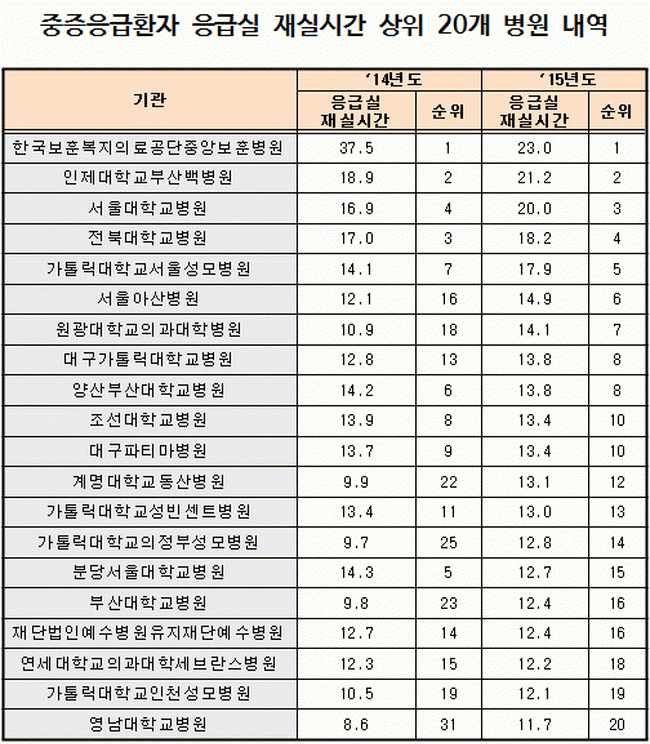 ½ÇÁ¦ »óÀ§ 20°³ º´¿øÀÇ ÀÀ±Þ½Ç °ú¹ÐÈÁö¼ö´Â 107%·Î, 2014³â(108%)°ú º°¹Ý Â÷À̰¡ ¾ø¾ú°í, ÁßÁõÀÀ±ÞȯÀÚ Àç½Ç½Ã°£ ¿ª½Ã Àü³âµµ¿Í µ¿ÀÏÇÑ 14.0½Ã°£À¸·Î »êÃâµÆ´Ù.