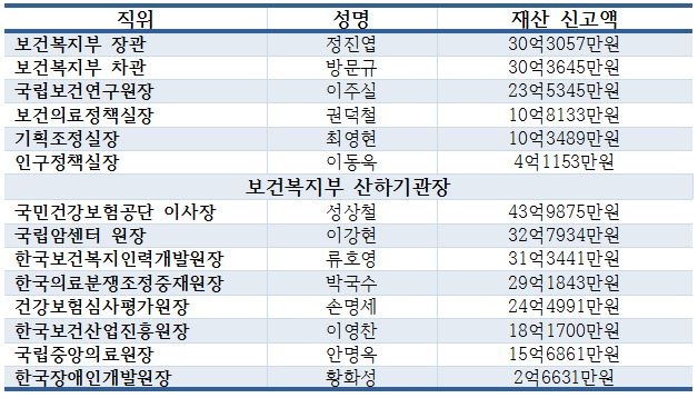 ±¹¹Î°Ç°º¸Çè°ø´Ü ¼º»óö ÀÌ»çÀåÀÇ º¸À¯ Àç»êÀº 43¾ï¿ø´ë·Î º¸°Çº¹ÁöºÎ ¼Ò¼Ó °íÀ§°øÁ÷ÀÚ Áß 1À§¸¦ Â÷ÁöÇß´Ù. Á¤Áø¿± Àå°ü°ú ¹æ¹®±Ô Â÷°üÀº 30¾ï¿ø ÀÌ»óÀÇ Àç»êÀ» º¸À¯Çϰí ÀÖ´Â °ÍÀ¸·Î ³ªÅ¸³µ´Ù.