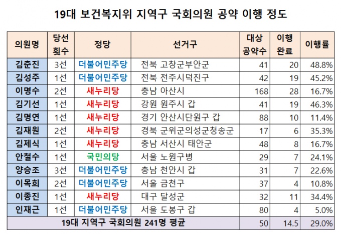 °ø¾à ÀÌÇà´ë»óÀ» ¼ö»óÇÑ 47¸í Áß À¯ÀÏÇÑ º¹ÁöÀ§ ¼Ò¼ÓÀÎ ±èÃáÁø ÀÇ¿øÀÇ °æ¿ì ÃÑ 41°³ °ø¾àÀ» ¹ßÇ¥Çß°í ÀÌ Áß 20°³¸¦ ÀÌÇàÇ߰ųª ÀÌÇàÀ» ¸¶¹«¸®Çß´Ù.