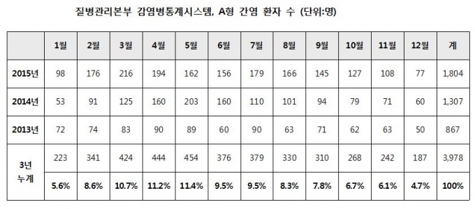 Áúº´°ü¸®º»ºÎ °¨¿°º´Åë°è½Ã½ºÅÛ¿¡¼ Áö³ 2013~2015³â±îÁö 3³â°£ AÇü°£¿° ȯÀÚ ¿ùº° ¹ß»ý ÃßÀÌ ºÐ¼® °á°ú, 4¿ù°ú 5¿ù ȯÀÚ°¡ °¡Àå ¸¹Àº °ÍÀ¸·Î ³ªÅ¸³µ´Ù.