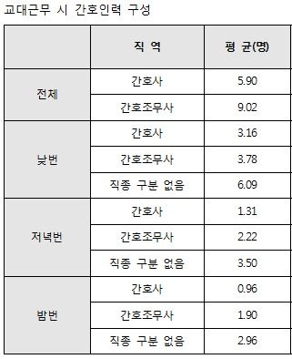 ±³´ë±Ù¹« ½Ã °£È£Àη ±¸¼ºÀº ³· ´ç¹øÀÇ °æ¿ì °£È£»ç 3.16¸í, °£È£Á¶¹«»ç 3.78¸íÀ̸ç Àú³á ´ç¹øÀº °£È£»ç 1.31¸í, °£È£Á¶¹«»ç 2.22¸í, ¹ã ´ç¹øÀº °£È£»ç 0.96¸í, °£È£Á¶¹«»ç 1.9¸íÀ¸·Î ³ªÅ¸³µ´Ù.