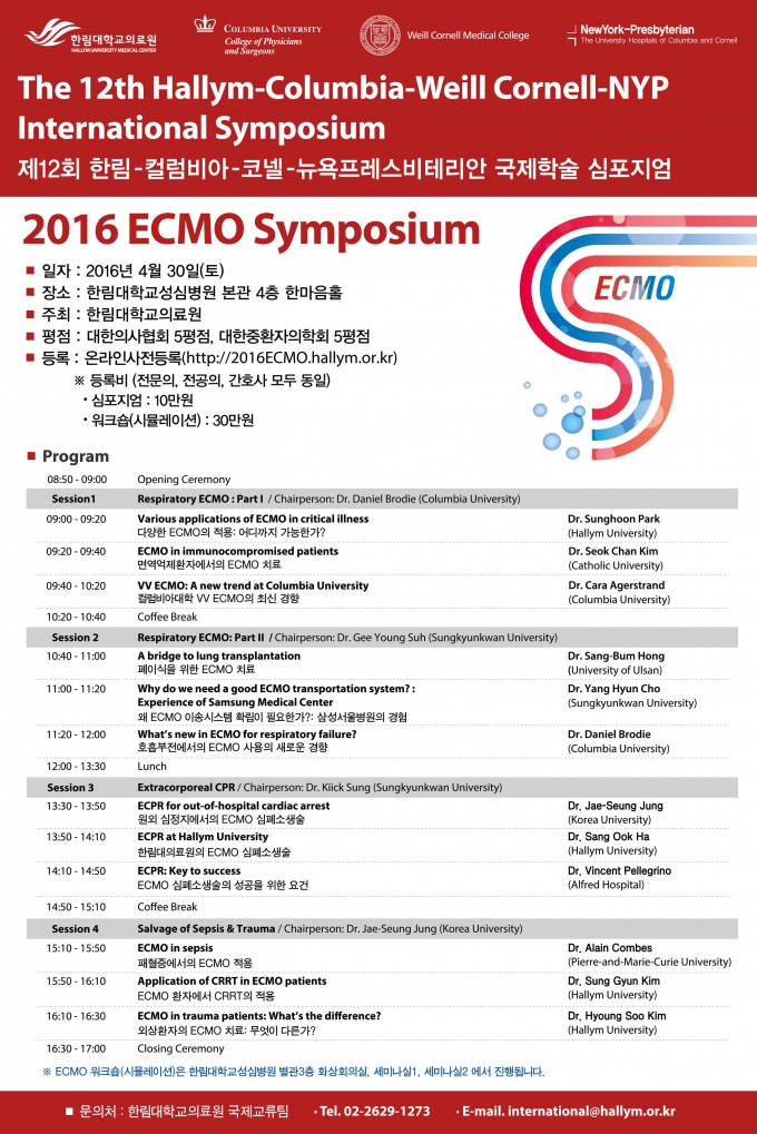 ¿ÃÇØ·Î 12ȸ¸¦ ¸Â´Â À̹ø °øµ¿ ½ÉÆ÷Áö¾öÀº ‘¿¡Å©¸ð(ECMO, ü¿Ü¸·Çü»ê¼ÒÈÀåÄ¡)’¸¦ ÁÖÁ¦·Î ¿¸®¸ç, ¹Ì±¹ Ä÷³ºñ¾Æ´ë ´Ù´Ï¿¤ ºê·Îµð(Daniel Brodie) ±³¼ö¿Í Ä«¶ó ¿¡°Å½ºÆ®·£µå(Cara Agerstrand) ±³¼ö, ÇÁ¶û½º ÆÄ¸® ÇÇ¿¡¸£-¸¶¸® Äû¸® ´ëÇÐ ¾Ë¶÷ ÄÞ½º(Alain Combes) ±³¼ö, È£ÁÖ ¸ð³ª½¬ ´ëÇÐ ºó¼¾Æ® Æç·¹±×¸®³ë(Vicent Pellegrino) ±³¼ö µî °ü·Ã ºÐ¾ß ÃÖ°í Àü¹®°¡µéÀÌ Âü¼®ÇÑ´Ù.