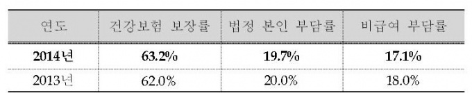 °ø´Ü¿¡ µû¸£¸é, Á¤ºÎÀÇ º¸À强 °ÈÁ¤Ã¥À¸·Î 2014³â Àüü °Çº¸ º¸Àå·üÀº 2013³âÀÇ 62.0%¿¡ ºñÇØ 1.2%p »ó½ÂÇÑ 63.2%¸¦ ±â·ÏÇß´Ù.