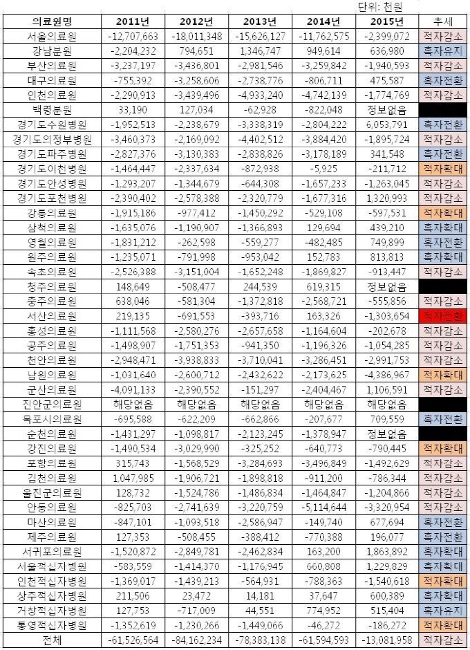 µ¥Àϸ®¸Þµð°¡ 9ÀÏ Àü±¹ 41°³ °ø°øÀÇ·á±â°ü(Áö¹æÀÇ·á¿ø 36°÷, Àû½ÊÀÚº´¿ø 5°÷)ÀÇ Áö³­ÇØ ´ç±â¼øÀÌÀÍÀ» Á¶»çÇÑ °á°ú, 2014³â Àüü 615¾ï¿ø ÀûÀÚ¿¡¼­ 2015³â 130¾ï¿ø ÀûÀڷΠ¼Õ½Ç ÆøÀÌ ÁÙ¾ú´Ù(´ç±â¼øÀÌÀÍ °ø°³ ¾ÈÇÑ 4°³ º´¿ø Á¦¿Ü).