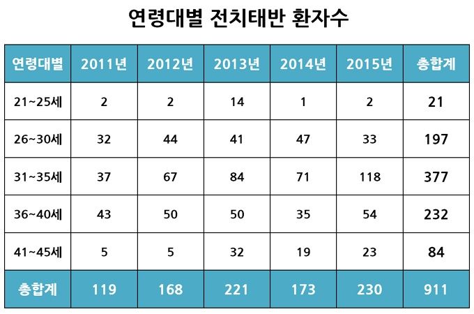 ¿¬·É´ëº°·Î´Â 30´ë ÃʹÝÀÎ 31~35¼¼ ȯÀÚ°¡ 41.4%(377¸í)·Î °¡Àå ¸¹¾Ò°í, 30´ë ÈĹÝ( 36~40¼¼)ÀÌ 25.4%(232¸í)·Î µÚ¸¦ À̾ú´Ù. °á°úÀûÀ¸·Î À̵é 30´ë°¡ 67%¸¦ Â÷ÁöÇß´Ù.