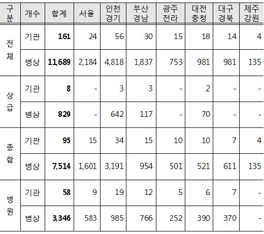 ÇÑÆí °£È£°£º´ÅëÇÕ¼ºñ½º Á¦°ø±â°üÀº Áö³ÇØ ¸» 112°³¼Ò(7500º´»ó)¿¡¼ ÇöÀç ÃÑ 161°³¼Ò(1¸¸1800º´»ó)°¡ µÆ´Ù. Á¾º°·Î µûÁ®º¸¸é »ó±ÞÁ¾ÇÕº´¿øÀº 8°÷, Á¾ÇÕº´¿øÀº 95°÷, º´¿ø 58°÷ÀÌ´Ù.