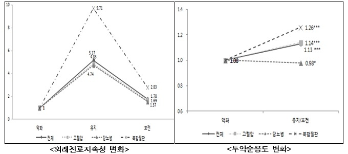 ¸¸¼ºÁúȯ°ü¸®Á¦¿¡ Âü¿©ÇÑ È¯ÀÚÀÇ °æ¿ì ±×·¸Áö ¾ÊÀº ȯÀÚ¿Í ºñ±³ÇØ ¿Ü·¡Áø·á Áö¼Ó¼ºÀÌ À¯Áö ¶Ç´Â È£ÀüµÉ °¡´É¼ºÀÌ 1.6~9.7¹è ´Ã¾ú°í, Åõ¾à¼øÀÀµµ ¿ª½Ã 1.1∼1.3¹è Áõ°¡Çß´Ù.