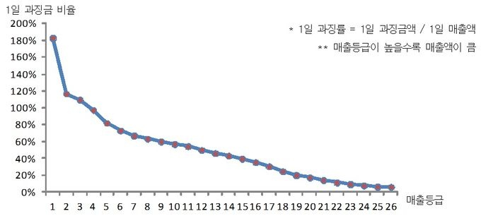 ¸ÅÃâ¾×ÀÌ ÀûÀº »ç¾÷ÀÚ¿¡°Ô´Â ¸ÅÃâ¾× ´ëºñ °ú¡±Ý ºñÀ²ÀÌ ³ô°í ¸ÅÃâ¾×ÀÌ ¸¹Àº »ç¾÷ÀÚ¿¡°Ô´Â ±× ºñÀ²ÀÌ ³·°Ô Ã¥Á¤µÇ°í ÀÖ´Ù´Â ÁöÀûÀ̾ú´Ù.