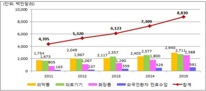 º¸°Çº¹ÁöºÎ(Àå°ü Á¤Áø¿±)¿¡ µû¸£¸é 2015³â º¸°Ç»ê¾÷ ¼öÃâ¾×Àº ¾à 10Á¶2608¾ï¿øÀ¸·Î, Àü³â´ëºñ 21% Áõ°¡Çß´Ù. 4³â Àü°ú ºñ±³ÇÏ¸é ¹«·Á 2¹è ÀÌ»ó ´Ã¾î³ ¼öÄ¡´Ù.