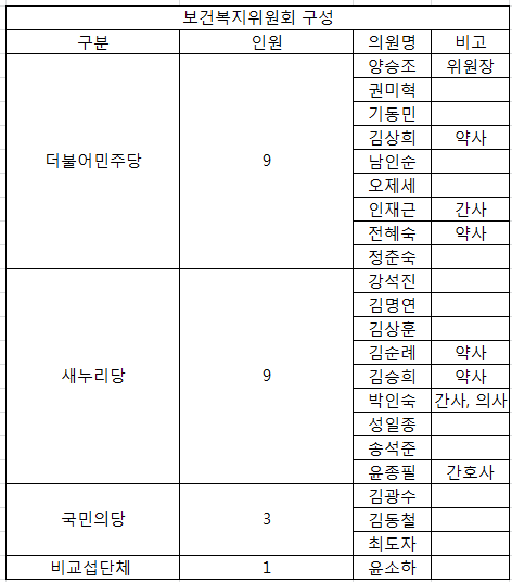 º¹ÁöÀ§¿¡´Â ±è±¤¼ö, ±èµ¿Ã¶, ÃÖµµÀÚ ÀÇ¿ø µî ±¹¹ÎÀÇ´ç ÀÇ¿øµµ 3¸í ¹èÁ¤µÆ´Ù. ±¹¹ÎÀÇ´çÀº ±è±¤¼ö ÀÇ¿øÀ» ´ç º¹ÁöÀ§ °£»ç·Î Á¤Çß´Ù. ºñ±³¼·´ÜüÀÎ Á¤ÀÇ´ç¿¡¼µµ ¾î¸°À̺´¿øÀÔ¿øºñ Áö¿ø¹ýÀ» ¹ßÀÇÇÑ À±¼ÒÇÏ ÀÇ¿øÀ» º¹ÁöÀ§·Î ¹èÁ¤Çß´Ù.