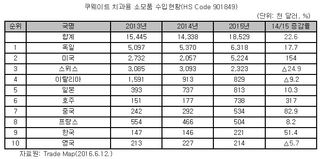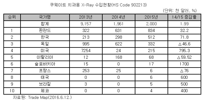 Trade Map¿¡ µû¸£¸é Äí¿þÀÌÆ®´Â Áö³ÇØ Çѱ¹ Ä¡°ú¿ë ÀÇ·á±â±â ¼öÀÔÀ» ±Þ°ÝÈ÷ ´Ã·È´Ù. ´ëÇ¥ÀûÀΠǰ¸ñÀ¸·Î´Â Ä¡°ú¿ë ¼Ò¸ðǰ°ú Ä¡°ú¿ë X-Ray°¡ ²ÅÈù´Ù.