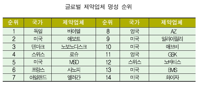 ±× °á°ú, ¹ÙÀÌ¿¤(µ¶ÀÏ)ÀÌ ±Û·Î¹ú Á¦¾à¾÷ü ¸í¼º 1À§¸¦ °è¼Ó À¯ÁöÇÑ °¡¿îµ¥ ¾Öº¸Æ®(¹Ì±¹)¿Í ³ëº¸³ëµð½ºÅ©(µ§¸¶Å©), ·Î½´(½ºÀ§½º), MSD(¹Ì±¹)°¡ »óÀ§ 5À§±Ç ³»¿¡ ÁøÀÔÇß´Ù.