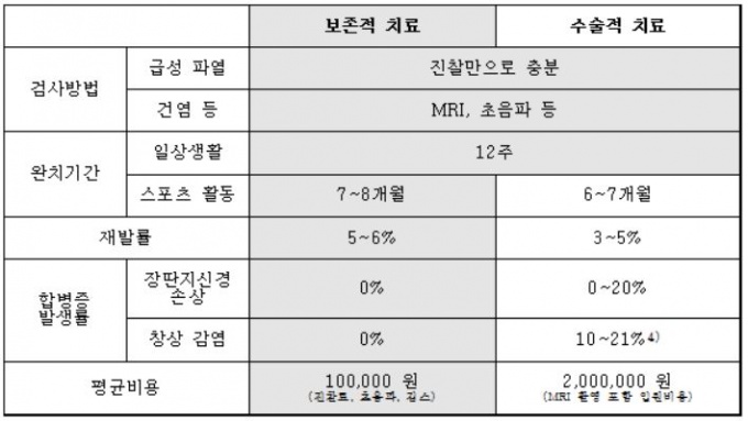 ´Ù¸¸ ¼ö¼úÀû Ä¡·á¸¦ ÇßÀ» °æ¿ì, º¸Á¸Àû Ä¡·áº¸´Ù Ã౸¿Í ³ó±¸, ¹èµå¹ÎÅÏ µî °ú°ÝÇÑ ½ºÆ÷Ã÷¸¦ Çϱâ±îÁö ¾à 1°³¿ù ´ÜÃà½Ãų ¼ö ÀÖ´Ù. Àç¹ß·üÀº ºñ½ÁÇϰí, ÇÕº´Áõ ¹ß»ý·üÀº ¼ö¼úÀû Ä¡·á¸¦ ÇßÀ» ¶§ º¸Á¸Àû Ä¡·áº¸´Ù ¾à 4¹è°¡ ³ô´Ù´Â ¿¬±¸°á°ú°¡ ÀÖ´Ù.