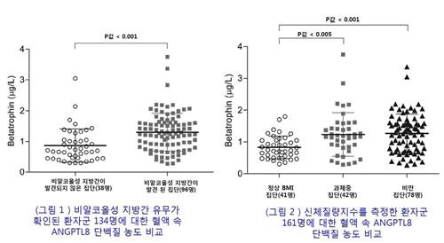 ±× °á°ú ºñ¾ËÄڿüº Áö¹æ°£À» º¸À¯ÇÑ È¯ÀÚ±ºÀº üÁú·® Áö¼ö¸¦ Æ÷ÇÔÇÑ °¢Á¾ Ç÷¾× ÁöÇ¥¿¡¼ ºñ¾ËÄڿüº Áö¹æ°£À» º¸À¯ÇÏÁö ¾ÊÀº ȯÀÚ±ºº¸´Ù Åë°èÀûÀ¸·Î À¯ÀÇÇÏ°Ô 'ANGPTL 8' ¼öÄ¡°¡ ³ô¾Ò´Ù.