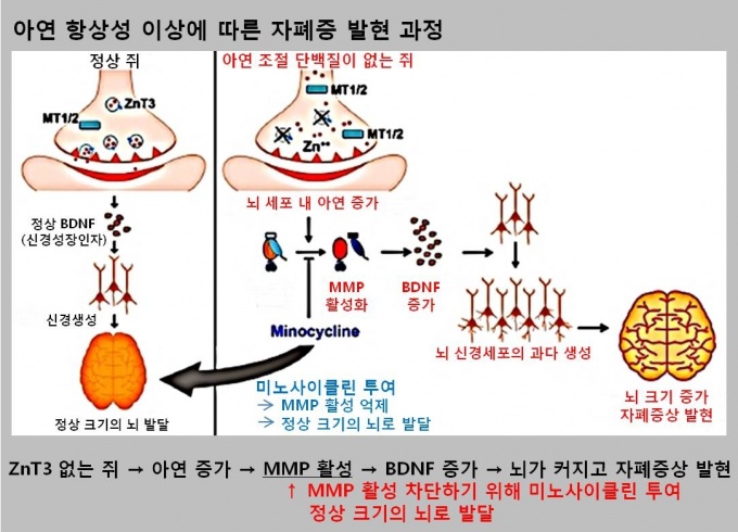 °á°úÀûÀ¸·Î ZnT3°¡ ¾ø´Â »ýÁã¿¡¼ ¼¼Æ÷ ³» ¾Æ¿¬ÀÇ Ç×»ó¼ºÀÌ ±úÁ® ¾Æ¿¬ ³óµµ°¡ Áõ°¡µÇ°í ¼¼Æ÷¿Ü ±âÁúÀ» ºÐÇØÇÏ´Â ´Ü¹éÈ¿¼ÒÀÎ matrix metalloprotease(MMP)°¡ Ȱ¼ºÈµÇ¸é¼ BDNF°¡ Áõ°¡, ³ú°¡ Ä¿Áö´Â Çö»óÀ» ÀÔÁõÇÑ °ÍÀÌ´Ù.