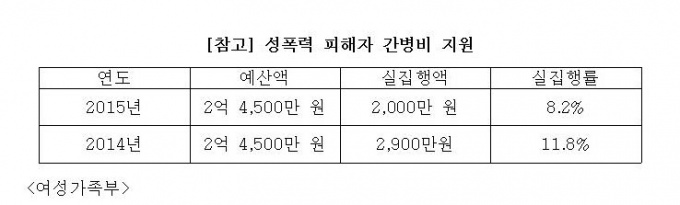 ¿©¼º°¡Á·ºÎ´Â ¼ºÆø·Â ÇÇÇØÀڵ鿡°Ô 1Àδç ÃÖ°í 300¸¸¿ø±îÁö °£º´ºñ¸¦ Áö¿øÇϱâÀ§ÇØ 2014³â°ú 2015³â¿¡ °¢°¢ 2¾ï4,500¸¸¿øÀÇ ¿¹»êÀ» Æí¼ºÇßÀ¸³ª ¿¹»êÀ» ´Ù ¾²Áö ¸øÇØ ºÒ¿ë ó¸®Çß´Ù.