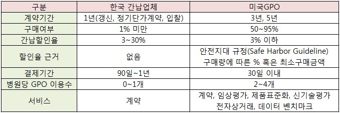 ÀÌ¿¡ ºñÇØ ¹Ì±¹ GPO´Â ¡ã°è¾à±â°£ 3³â, 5³â ¡ã±¸¸Å¿©ºÎ 50~95% ¡ã°£³³ÇÒÀÎÀ² 3%ÀÌÇÏ ¡ãÇÒÀÎÀ² ±Ù°Å ¾ÈÀüÁö´ë±ÔÁ¤(Safe Harbor Guideline), ±¸¸Å·®¿¡ µû¸¥ % ȤÀº ÃÖ¼Ò±¸¸Å±Ý¾× ¡ã°áÁ¦±â°£ 30ÀÏ À̳» ¡ãº´¿ø´ç GPO ÀÌ¿ë¼ö 2~4°³ ¡ã¼ºñ½º °è¾à, ÀÓ»óÆò°¡, Á¦Ç°Ç¥ÁØÈ, ½Å±â¼úÆò°¡, ÀüÀÚ»ó°Å·¡, µ¥ÀÌÅÍ º¥Ä¡¸¶Å© µî ±¹³» °£³³¾÷ü¿¡ ºñÇØ ÀÇ·á±â±â ¾÷ü¿¡ À¯¸®ÇÑ ³»¿ëÀÌ Æ÷ÇԵŠÀÖ¾ú´Ù.