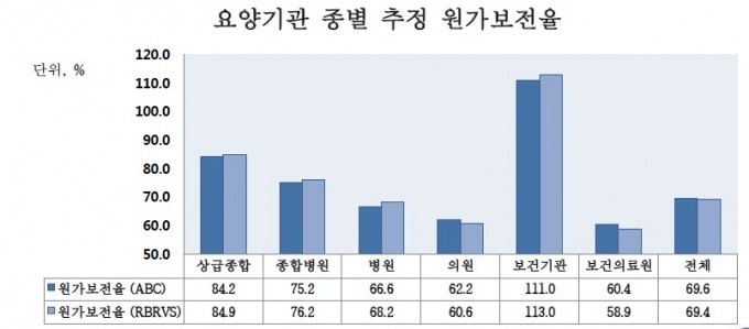 ¿ø°¡ º¸ÀüÀ²À» Á¾º°·Î ±¸ºÐÇÏ¸é ¡ã»ó±ÞÁ¾ÇÕº´¿ø 84.2% ¡ãÁ¾ÇÕº´¿ø 75.2% ¡ãº´¿ø 66.6% ¡ãÀÇ¿ø 62.2% ¼öÁØÀ¸·Î ³ªÅ¸³µ´Ù. Ȱµ¿±âÁØ ¿ø°¡(ABC), »ó´ë°¡Ä¡(RBRVS) ¸ðµÎ°¡ Á¦½ÃµÆ´Âµ¥, ÀüÀÚ¸¦ ±âº» ¼öÄ¡·Î »êÃâÇß´Ù.