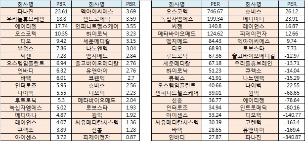 À̹ۿ¡ ÆÄ³ªÁø, ¿ì¸®µéÈ޺극ÀÎ, ¿¡ÀÌÆ¼Á¨, ³ªÀ̺¤, Å¥·º¼Ò, ÀÎÆ®·Î¸Þµñ, ³ª³ë¿£ÅØ, ¼Ö°í¹ÙÀÌ¿À¸ÞµðÄ®, À¯¾Ø¾ÆÀÌ, ÄÚ·»ÅØ, µð¿ÀÅØ, ¿øÀÍ µîÀº EPS°¡ 0 ÀÌÇÏÀÎ ÀûÀÚ±â¾÷À¸·Î ¸¶À̳ʽº PERÀ» º¸¿´´Ù.