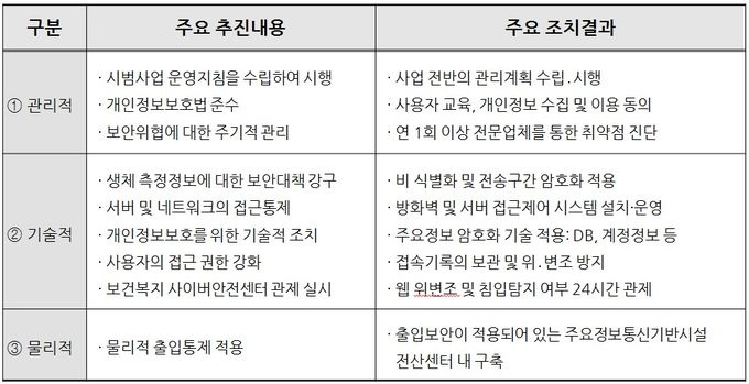 º¸¾ÈÀÇ °æ¿ì °³ÀÎÁ¤º¸º¸È£¹ý µî °ü·Ã ¹ý·É¿¡ µû¸¥ °ü¸®Àû, ±â¼úÀû, ¹°¸®Àû º¸¾È Á¶Ä¡¸¦ ºÐ¼®ÇÑ °á°ú 1Â÷ ½Ã¹ü»ç¾÷ ´ç½Ã °³¹ßÇÑ °¡À̵å¶óÀÎÀ» Àû¿ëÇØ ¾ÈÀüÇÏ´Ù°í Æò°¡µÆ´Ù.