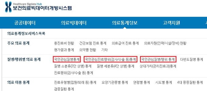 http://opendata.hira.or.kr ¢ºÀÇ·áÅë°èÁ¤º¸ ¢ºÁúº´/ÇàÀ§º° ÀÇ·áÅë°è ¢º±¹¹Î°ü½ÉÅë°è(Áúº´Åë°è, Áø·áÇàÀ§Åë°è, Áúº´/ÇàÀ§Åë°è)¿¡¼ Á¦°øµÇ´Â ¼ºñ½º´Ù.